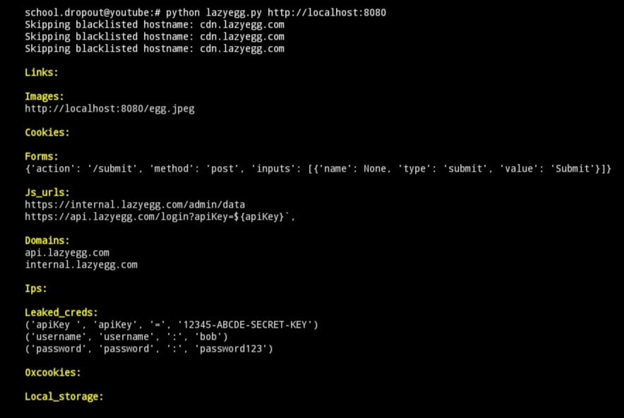 Extracts links, images, cookies, forms, JS URLs, localStorage, Host, IP, and leaked credentials. Supports scanning single or multiple JavaScript files. Includes a Chrome extension for real-time logging of JS files.
